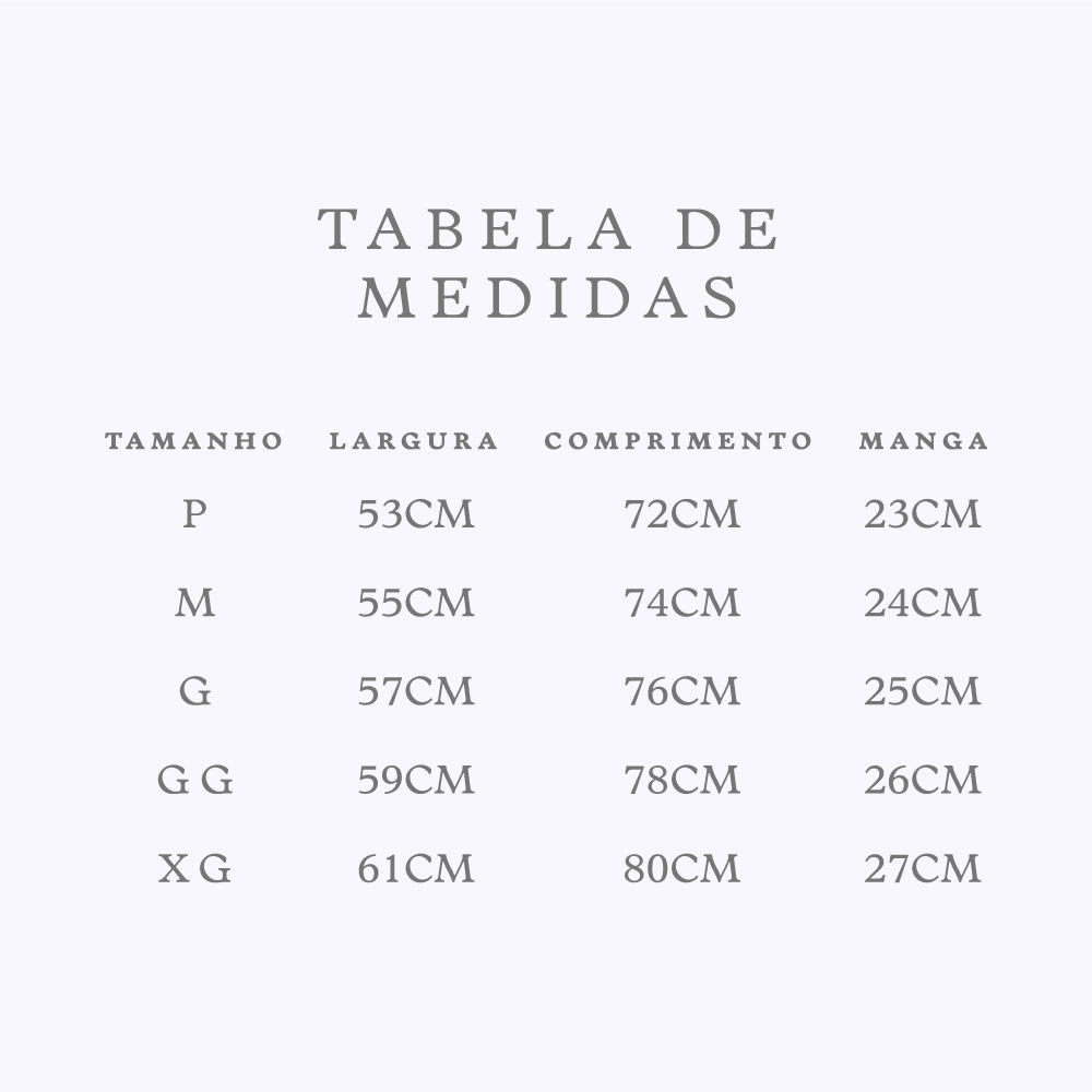 - Etiqueta interna: Impressa em DTF com composição e tamanho na região do ombro